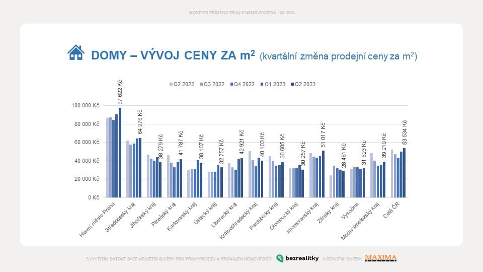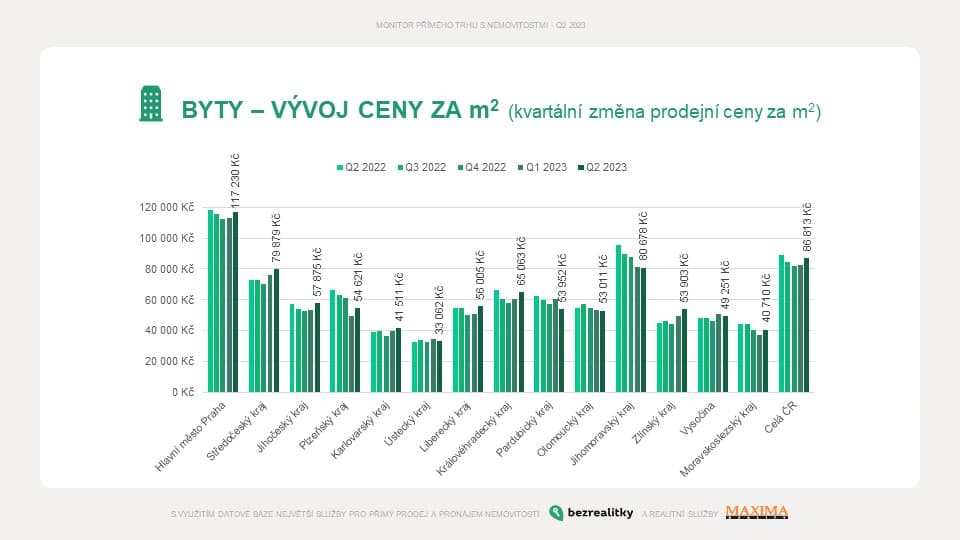 Když se podíváme na rodinné domy, Moravskoslezský kraj roste, Zlínský stagnuje a Olomoucko klesá. Co se týče bytů, Zlínsko a Moravskoslezský kraj roste, Olomoucko stagnuje a Jihomoravský kraj už se několikátý měsíc propadá. Ceny bytů zde klesají již déle než rok a vůbec poprvé v historii měření se svojí průměrnou cenou přibližují cenám v již zmiňovaném Středočeském kraji.