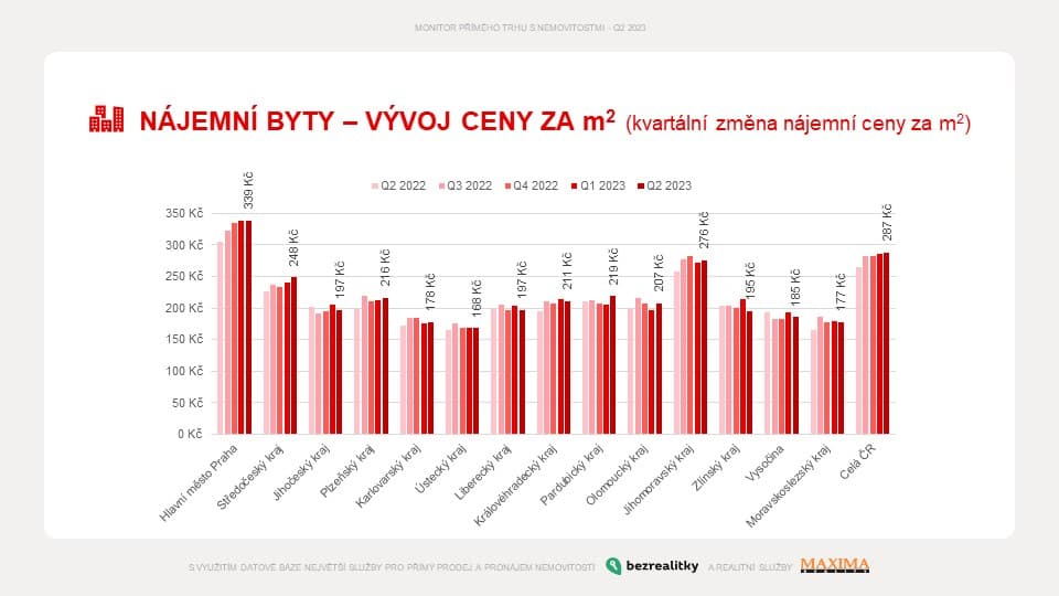 I nájemníci budou muset sáhnout hlouběji do kapsy. V Praze dají za nájem v průměru 340 korun za metr čtvereční, ve Středočeském kraji je pak bydlení vyjde na 248 korun za metr čtvereční. Naopak v Brně a obecně Jihomoravském kraji zaznamenaly statistiky po jarním propadu stagnaci. Kdo čekal další slevy, bohužel se nedočkal, útěchou mu může být to, že růst je nižší než inflace.