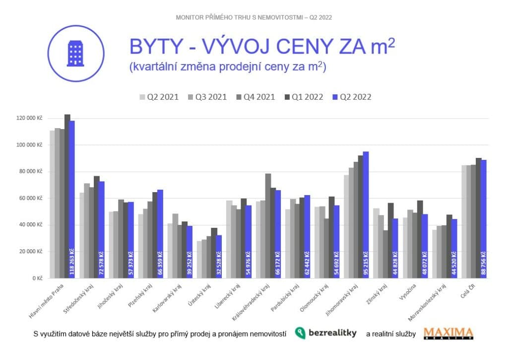 Začněme dobrou zprávou – ceny začaly klesat, především ale u bytů. Průměrná cena bytu v Česku se snížila poprvé od zimy roku 2019. Na začátku léta se prodávaly za 88 756 korun na metr čtvereční, tedy o 2 % levněji než na jaře, a to navzdory rekordní inflaci. Na pokles cen neměla vliv ani nabídka. K mání byly stejně kvalitní nemovitosti jako v předchozích měsících a Češi si za stejné peníze často pořídili mírně větší nebo lépe situovaný byt než v předchozím kvartálu.