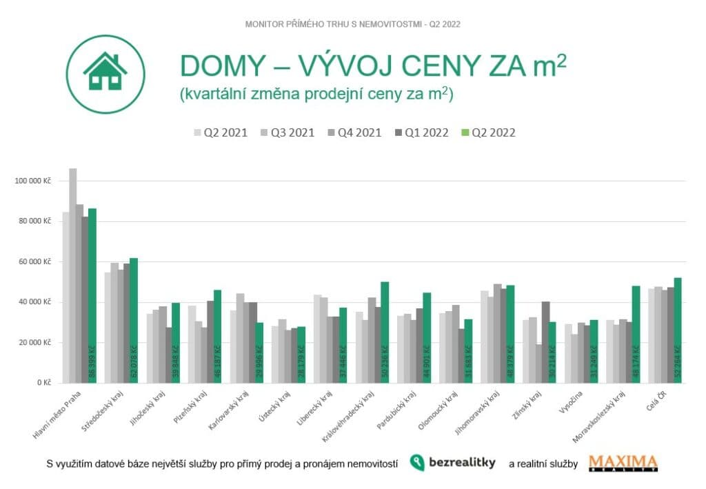 Plošný propad nebo růst se netýká ani rodinných domů. Výkyvy v jednotlivých krajích má na svědomí velké množství domů před generální rekonstrukcí – tradičně například Karlovarský, kde statistika zachytila 25 % pokles. Ústecký kraj sice vykazuje ještě 3 % růst, ale dá se předpokládat, že v příštím kvartálu se trend také obrátí. Překvapivý je také propad cen ve Zlínském kraji (o celou čtvrtinu). Naopak rekordně rostly ceny v Moravskoslezském kraji, kde se začaly prodávat i dražší nemovitosti, což průměrnou cenu zvedlo o skoro 60 % na 48 174 korun za metr čtvereční. Podobně vyrostl i Jihočeský kraj – o 44 % na 39 848 korun za metr čtvereční.