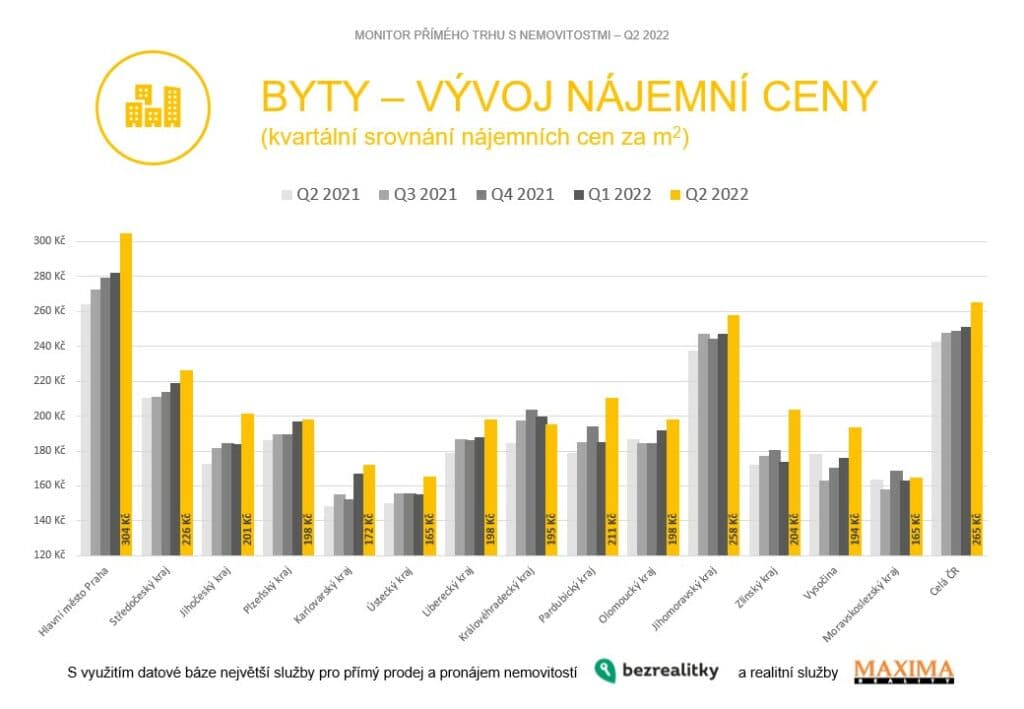 V Praze se navíc na růstu cen podílí opětovný start krátkodobých turistických pronájmů. Nájem se tu tak poprvé dostal nad třísetkorunovou hranici. Průměrný byt se na začátku léta nabízel za 304 korun za metr. Mezi nejžádanějšími byly garsonky a byty 2+1, mírně pak posílily „rodinné byty“ s alespoň třípokojovou dispozicí nad 75 metrů čtverečních.