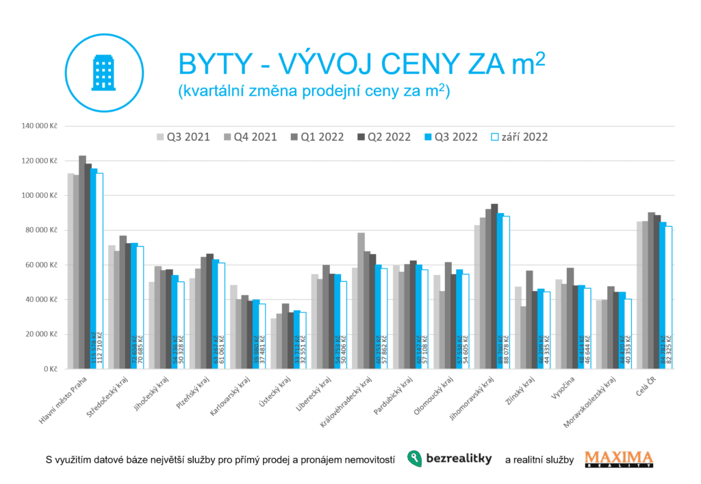 O něco méně pak klesaly byty v Praze a Brně, i přesto se dostali na ceny loňského roku. Pražský byt se v září nabízel za takřka stejnou cenu jako před rokem – 112,7 tisíce korun na metr čtvereční. Brněnské a obecně jihomoravské byty klesly v září oproti jaru o celých 8 % a vrací se s hodnotou 88 tisíc na metr čtvereční.