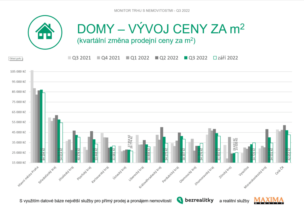 Ještě rychleji než byty klesají průměrné ceny rodinných domů. Například v Jihomoravském kraji se oproti jaru snížila cena za metr čtvereční o celých 17 % na 41,4 tisíce korun. V Moravskoslezském kraji byl propad cen nabízených objektů ještě výraznější – o celých 40 % na 34,5 tisíce korun za metr čtvereční. Středočeský kraj pak hlásí 14% propad na 54,6 tisíce korun za metr čtvereční.