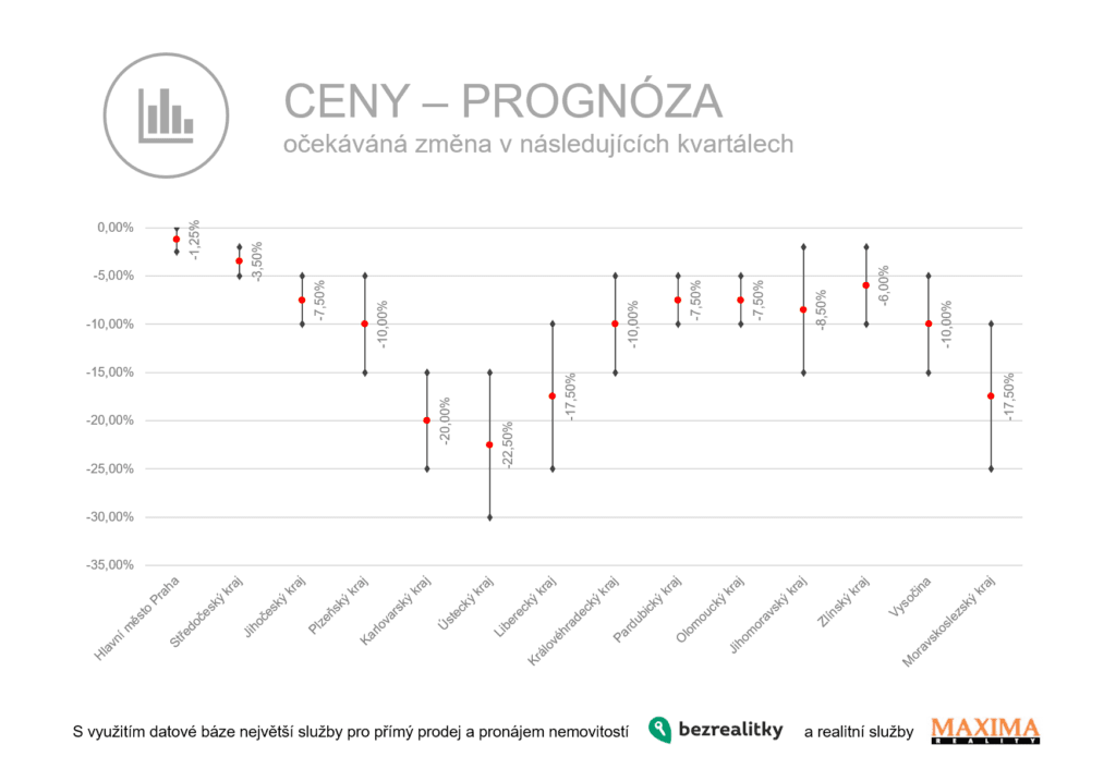 Nejvíce zasažené budou chudší kraje – například v Ústeckém kraji je odhadován pád cen v rozmezí 10–30 % podle konkrétní lokality a typu nemovitosti. V Moravskoslezském a Libereckém kraji se majitelé musí připravit na snížení ceny o 10–25 %. Karlovarský kraj může očekávat pokles o 15–25 %.
