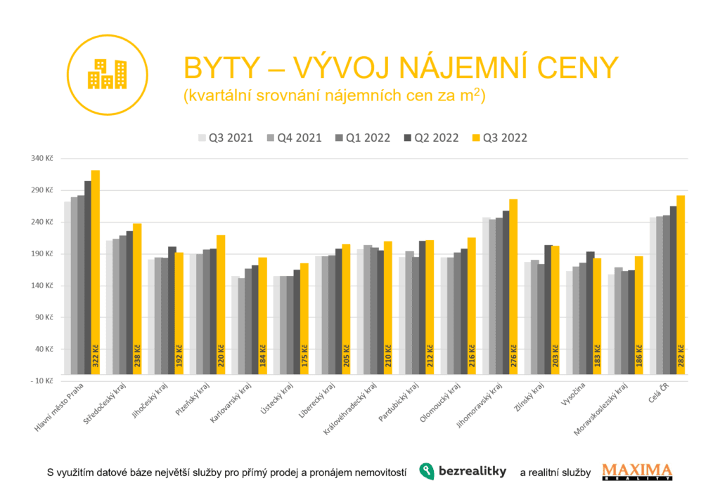 V Praze se na konci září ceny dostaly nad 322 korun za metr čtvereční, ve Středočeském kraji stouply na 238 korun za metr čtvereční, v Brně se zvýšily ceny na 276 korun za metr čtvereční. Oproti předchozímu kvartálu se tak v těchto případech jednalo o 5–7% růst.