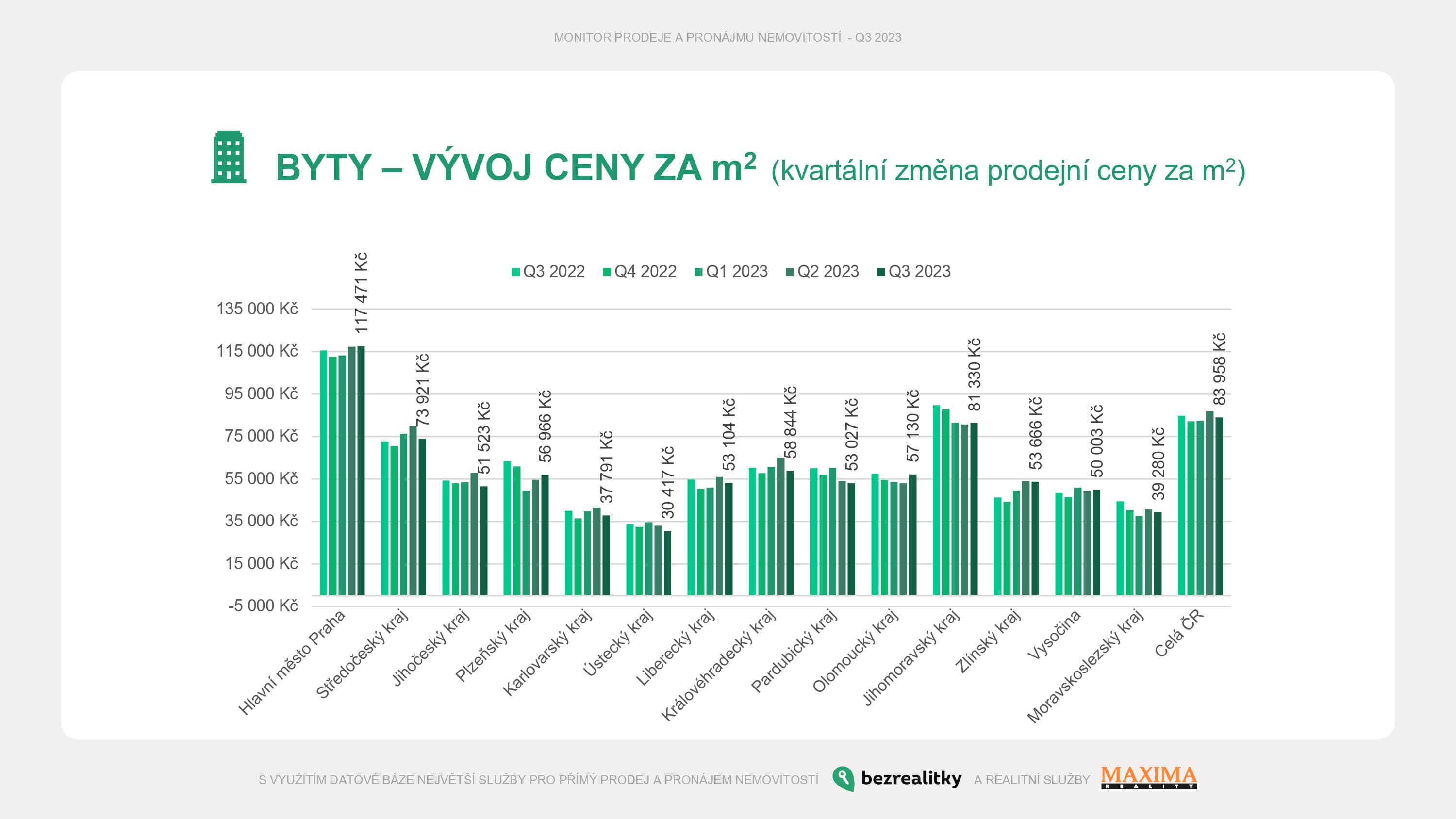 V případě bytů je trend jasný napříč republikou – stagnace a pokles. Po letním oživení zařadil pražský trh neutrál a ukazuje, kde bude pravděpodobně do konce roku ležet jeho strop. Průměrná cena staršího bytu se nyní pohybuje kolem 117,5 tisíce korun – vzrostla tedy minimálně.