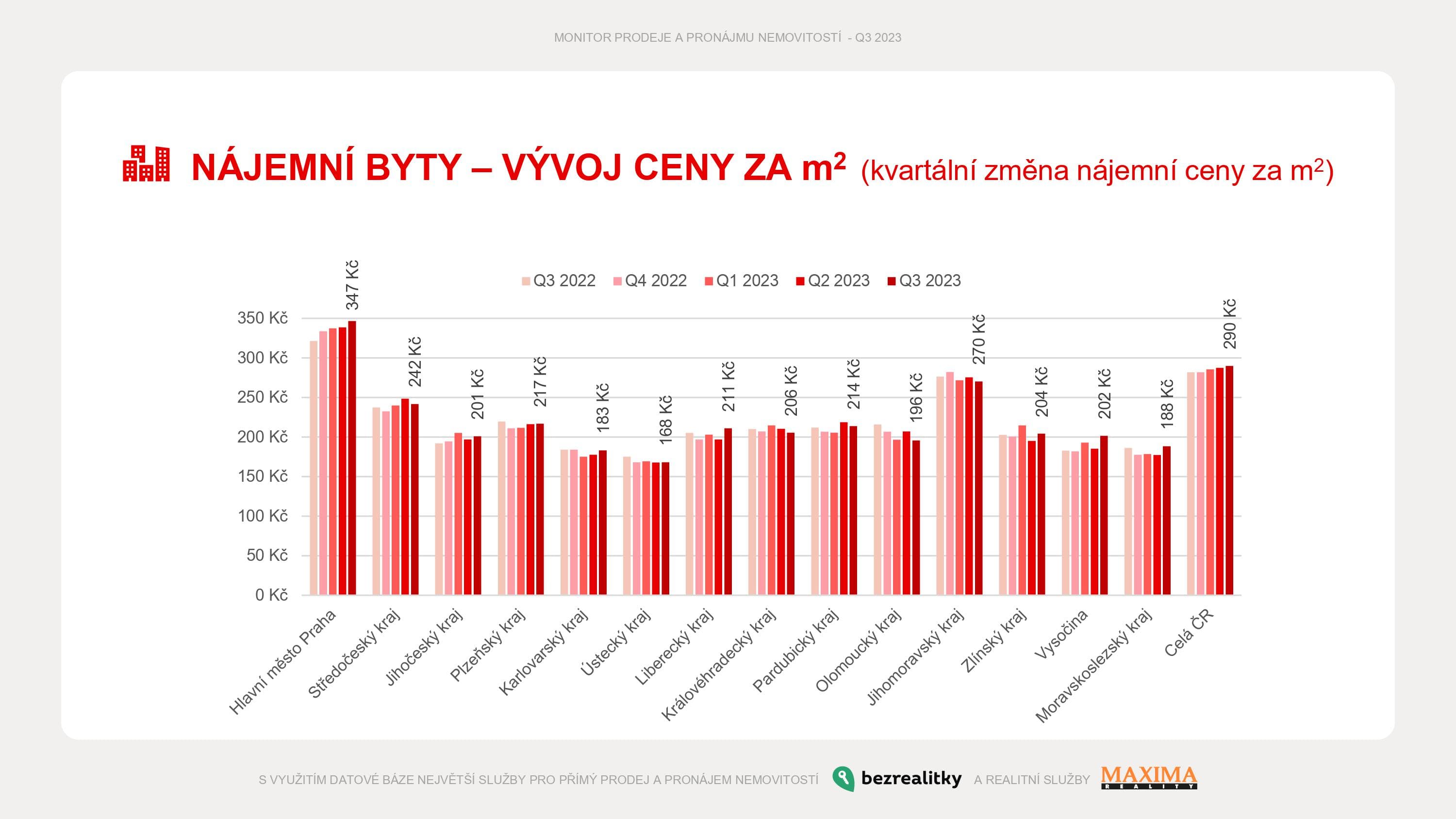 V růstu tradičně pokračovala Praha, kde nájemníci zaplatí v průměru 347 korun za metr čtvereční. Do jisté míry jde o reakci na sezonu – konec třetího kvartálu zvedá ceny díky vysoké poptávce vysokoškolských studentů.