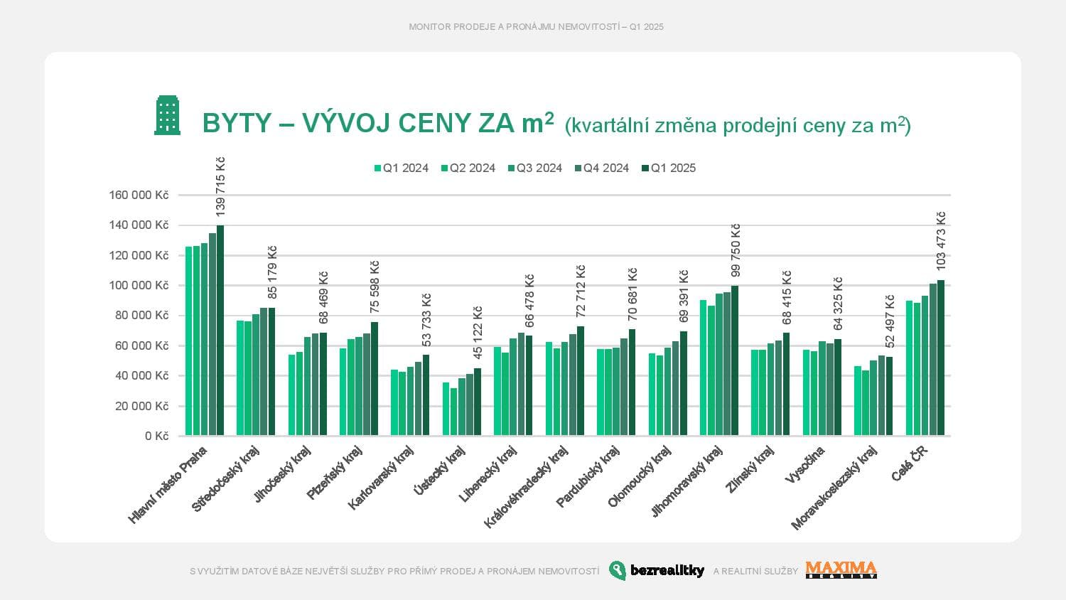 Stále vzhůru. Takový směr nabraly ceny bytů ve většině krajů. V Praze vzrostly mezikvartálně o 4 %, což je nejvyšší nárůst od loňského jara. Průměrná cena bytu nyní činí 139 715 Kč/m² a atakuje tak hranici 140 tisíc. Kdo s nákupem váhal a přemýšlel o něm vloni, si dnes připlatí 12 %.