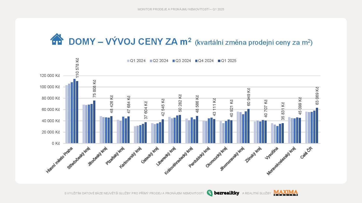 Zájem o domy je i ve Středočeském kraji, kde je největší poptávka po bydlení v lokalitách kolem Prahy, jako jsou Kladno, Beroun, Neratovice, Roudnice, Brandýs nad Labem-Stará Boleslav. Jejich průměrné ceny oproti zimě zdražily skokově o celých 8 % a poprvé v historii se dostaly nad hranici 75 808 Kč/m².
