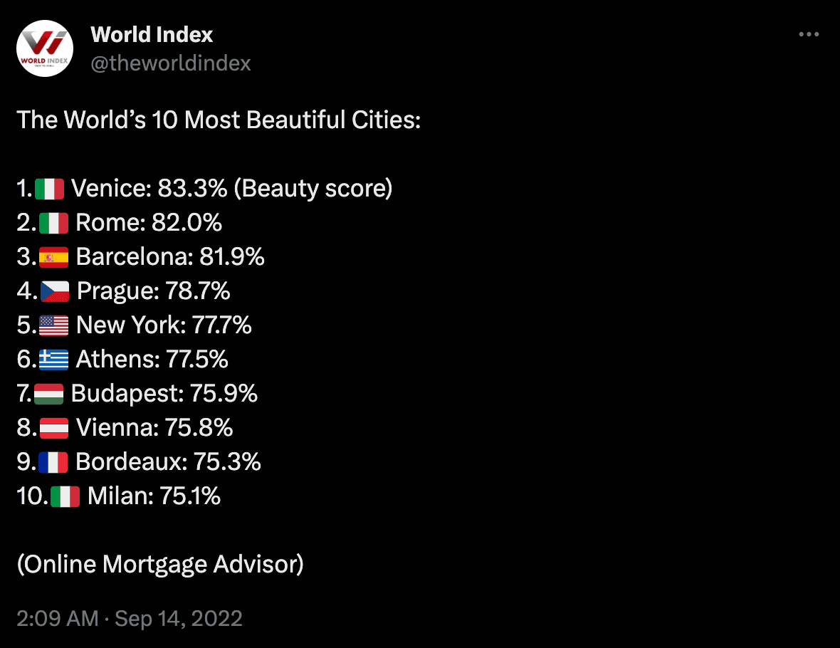 Navíc Praha si vede skvěle i ve více analytickém žebříčku atraktivity evropských měst Living Cities Index, který sleduje demografické a ekonomické aspekty měst s přihlédnutím na vzdělání a dopravu v metropoli. Praha je v nejlepším kvadrantu spolu s Paříží nebo Londýnem. Tento index slouží velkému německému fondu Patrizia, který se soustředí na nájemní bydlení, jako indikátor pro investiční rozhodování.