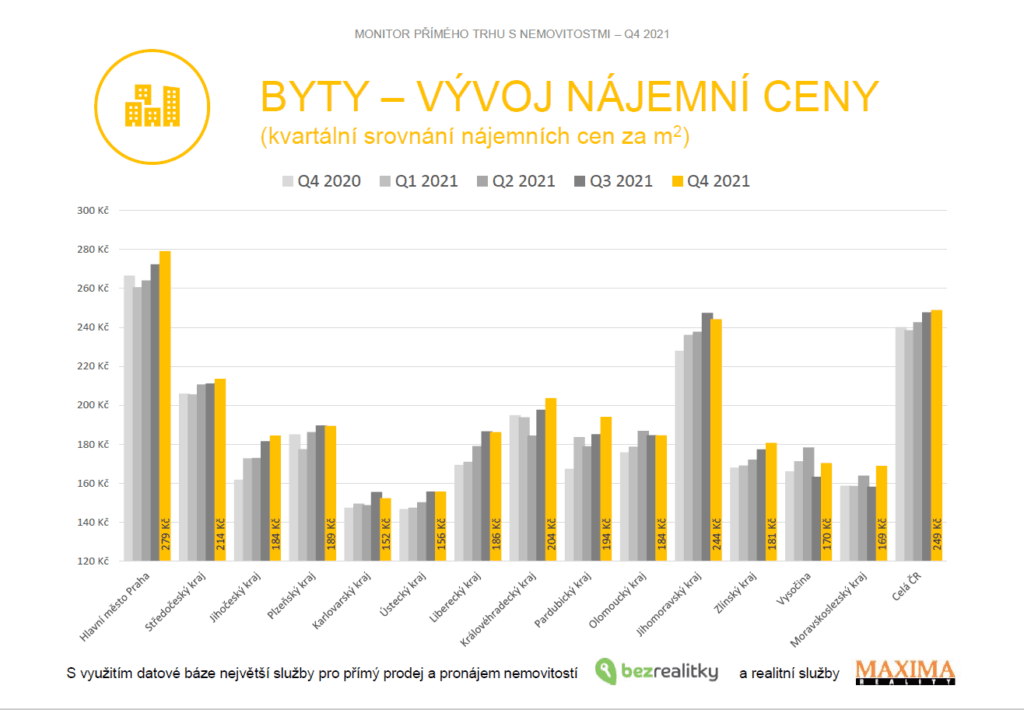 Zajímavá situace nastala na trhu s nájemním bydlení. Očekávaný skokový růst poptávek se ve čtvrtém kvartálu zatím nedostavil – uzavřených nájemních smluv bylo nakonec méně než na podzim. Přesto ceny v Praze vystoupaly na maximum od vypuknutí koronavirové krize – růst je tentokrát v podstatě plošný a tlačí ho především inflace. Průměrný metr čtvereční bytu se pronajímá za 279 korun. Naopak Brno reaguje oproti předchozímu kvartálu mírným poklesem na 244 korun.