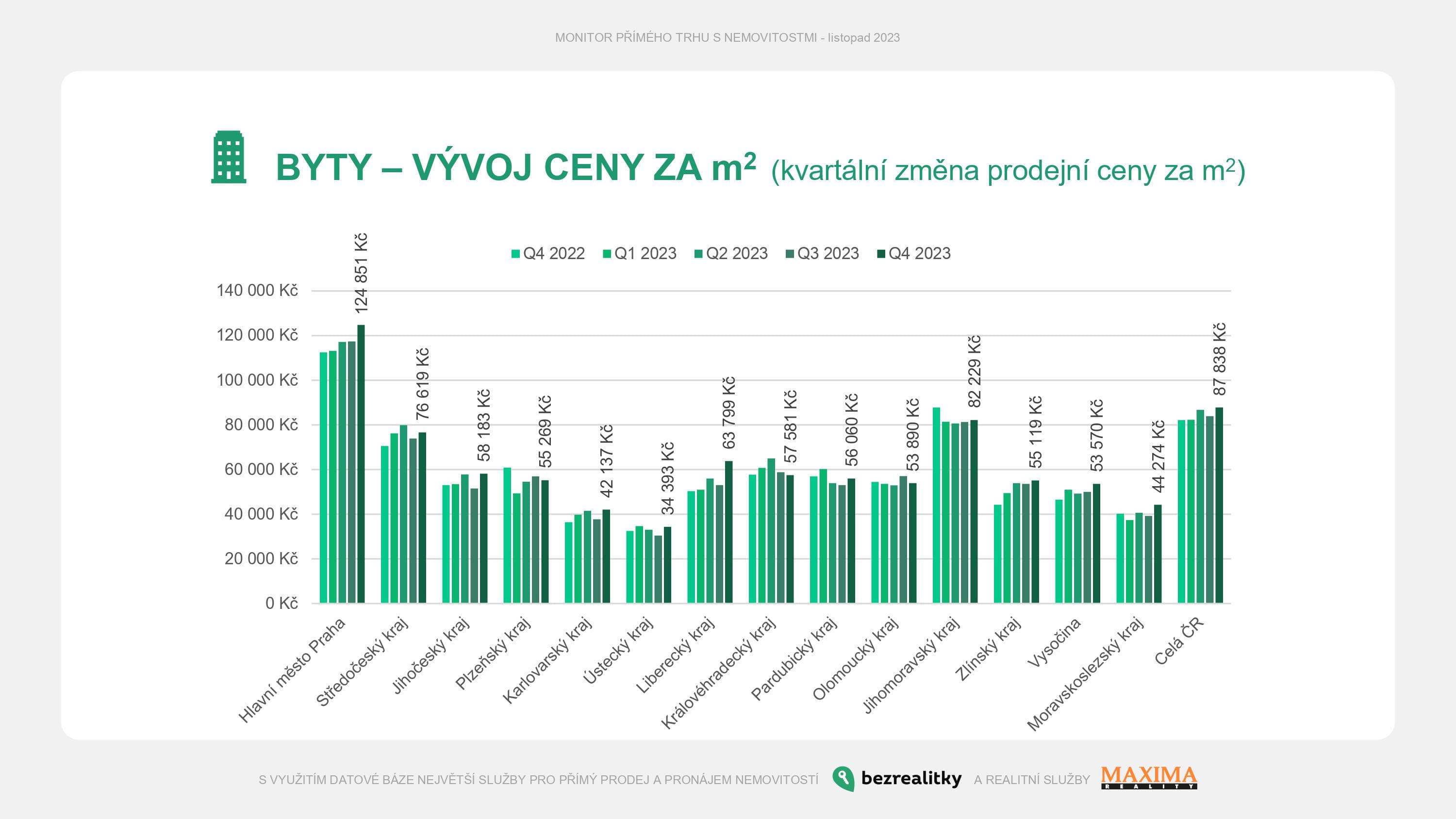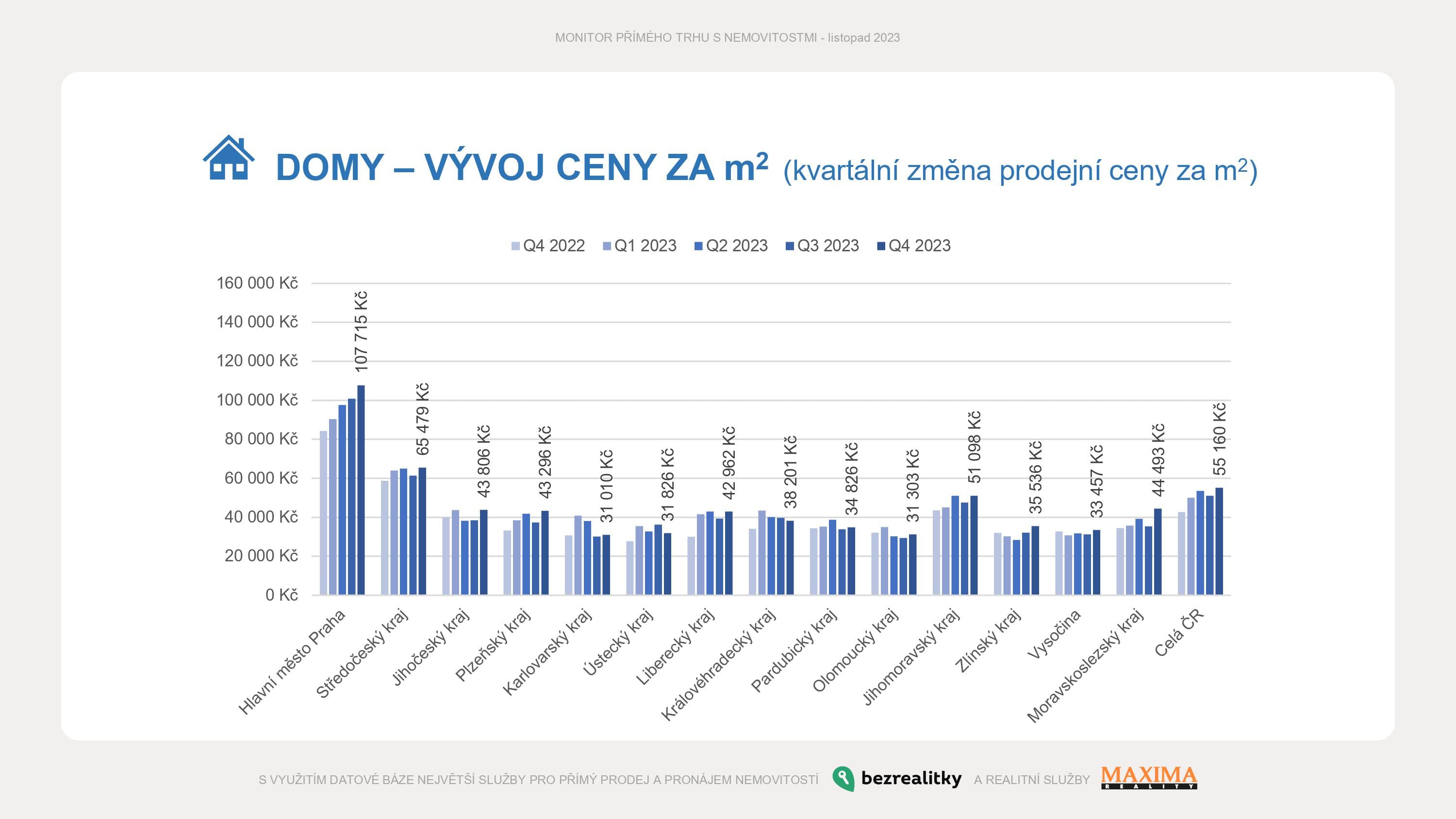 Ty, kteří chtějí zaměřit svou pozornost spíše na domy, nečeká žádná velká změna. V růstu cen pokračovaly rodinné domy v Plzeňském, Moravskoslezském i Středočeském kraji. Útěchou může alespoň to, že se tu sice posunuly na své nové maximum, nicméně aktuální nijak nevybočují z dlouhodobé hladiny, do které se dostaly posledním výrazným zdražením na podzim roku 2022.