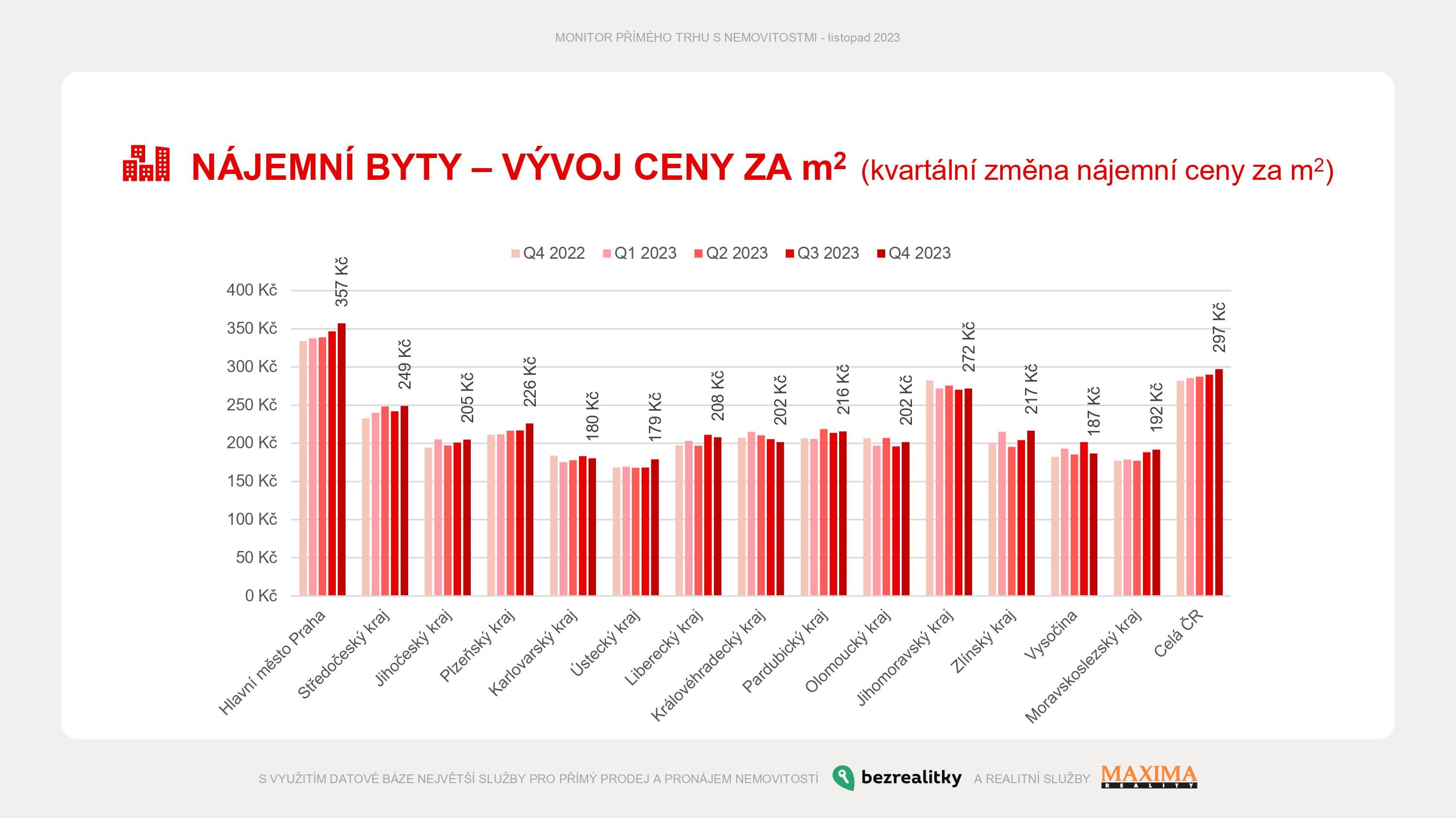 Ceny nájemního bydlení na rozdíl od ceny domů a bytů podle očekávání rostly napříč republikou. Výjimkou byla pouze Vysočina a Karlovarský a Královehradecký kraj.