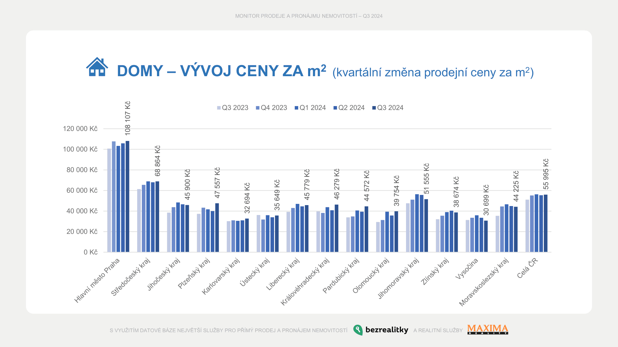 Ceny rodinných domů rostly napříč republikou, klesaly pouze na jižní Moravě a Vysočině. V Praze meziročně vzrostly o 7 % a zastavily se na 108 107 Kč/m2.