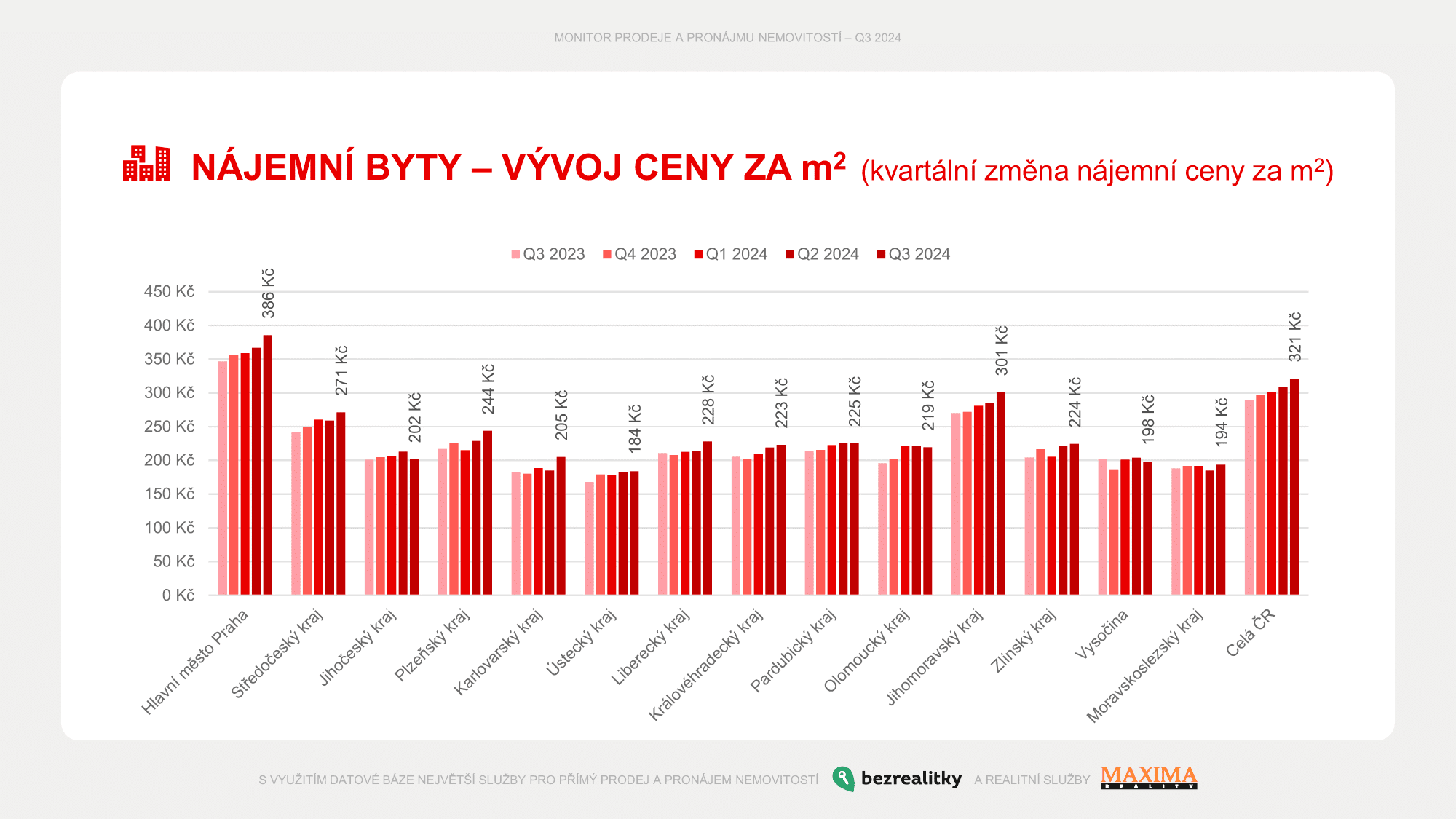 Vysoká poptávka po nájemním bydlení pochopitelně vytváří tlak na růst cen, které se v celorepublikovém průměru mezikvartálně zvýšily asi o 4 %, v Praze se oproti předchozímu kvartálu ceny zvýšily o 5 % na 356 Kč za metr nájemní plochy. V Brně byl oproti předchozímu kvartálu 6 % růst na 301 Kč za metr. Připlatí si také obyvatelé Středočeského kraje, kde se ceny dostaly na 271 Kč za metr nájemní plochy.